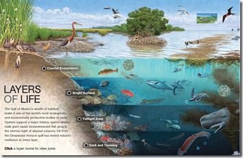 Review: Layers of Life is a beautiful interactive by National Geographic. Basically this interactive is aimed towards educating about the effects of Gulf Oil Spill on the Marine Eco system. But the educational benefit of this interactive is not limited to the effects of oil spill. You can use it as a means of learning more about the marine animals and plants, their interdependence, their role in the marine Eco system and their role in the marine trade of Florida and around. You can use this interactive when teaching about marine food webs, or about the marine animals and plants in general. You can learn about which animals are found at which depth inside the ocean and what role does the depth of the ocean play in the occurrence of these animals and plants. There are four zones or layers to explore: Coast and shore, Bright surface, Twilight Zone and Dark and Teeming. As with every National Geographic resource, it is rich in art and gloriously detailed.